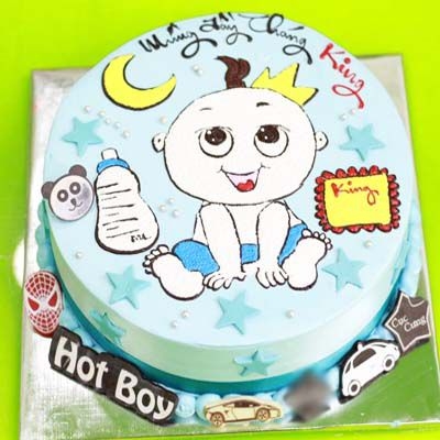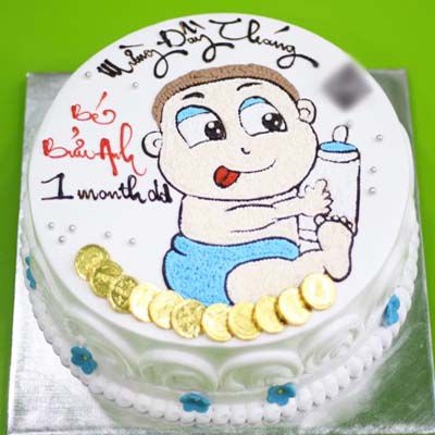 Mẫu bánh kem nhân dịp đầy tháng có tạo hình siêu đáng yêu. Đó có thể là hình vẽ một em bé kháu khỉnh đang vui cười hay chú thú cưng tinh nghịch, hóm hỉnh. Những hoạ tiết sống động cùng lời chúc đong đầy yêu thương là món quà ý nghĩa hân hoan chào đón con yêu đến với thế giới. Đồng thời gửi gắm lời chúc tốt lành, mong bé mau ăn chóng lớn, ngoan ngoãn và mạnh khỏe.